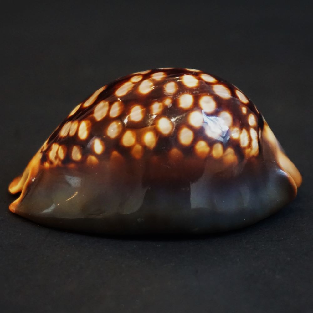 Muszle z tej dostawy pochodzą z Filipin. Eksponat w pełni dorosły, acz niewielki, brązowa kolorystyka z wyraźnym rysunkiem, ciekawy jasnobrązowy callus. Prezentujemy zdjęcia konkretnego eksponatu w różnych warunkach oświetlenia: 67 mm. Niewielkie przebielenie callusa z lewej strony muszli.