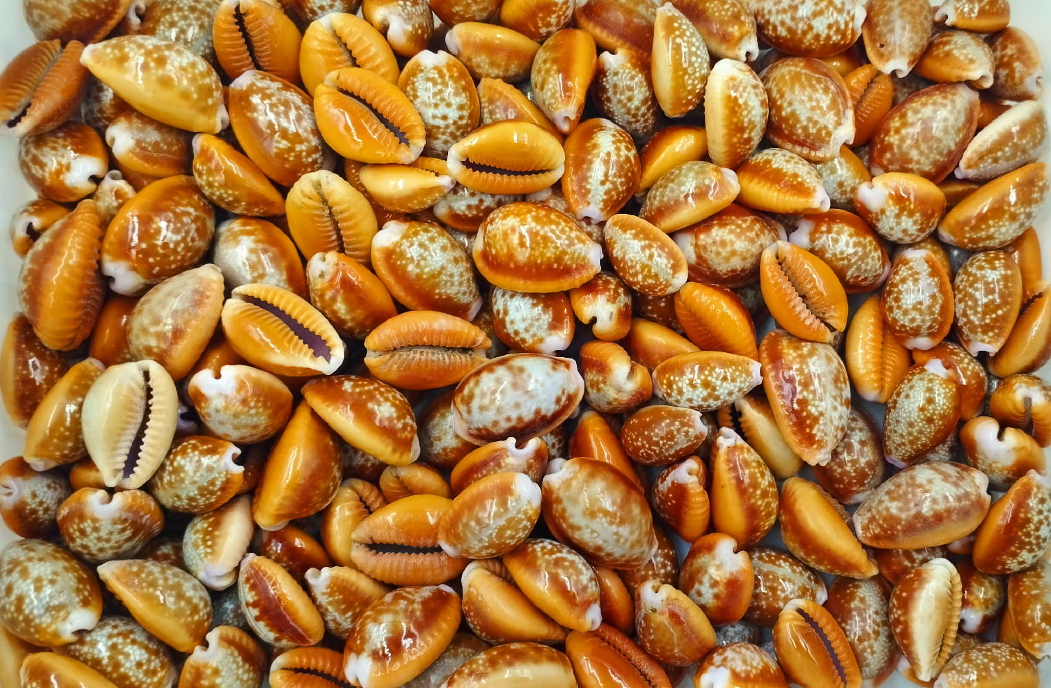Porcelanka helvola to bardzo popularna porcelanka, występująca w bogactwie odcieni kolorystycznych i wzorów (co pokazujemy na dodatkowym zdjęciu!). W tej ofercie muszle z Filipin z naszej dostawy z lat 90-tych XX w. Zdjęcia przedstawiają typowe egzemplarze w różnych warunkach oświetlenia - przy zamówieniu kilku sztuk wybieramy różniące się eksponaty. 18-22 mm, F++/Gem.