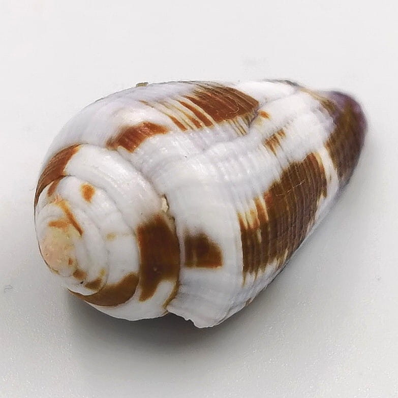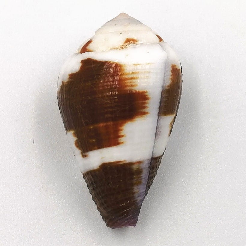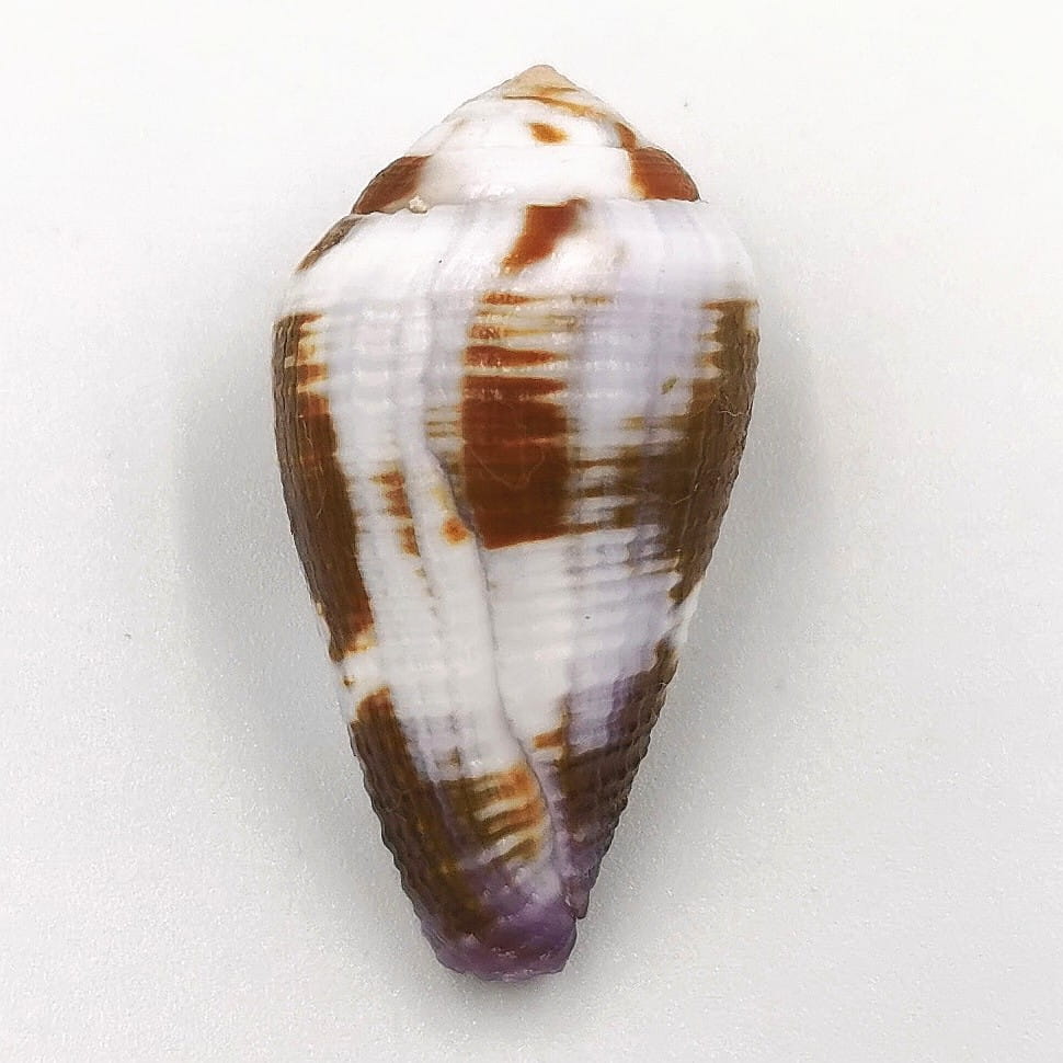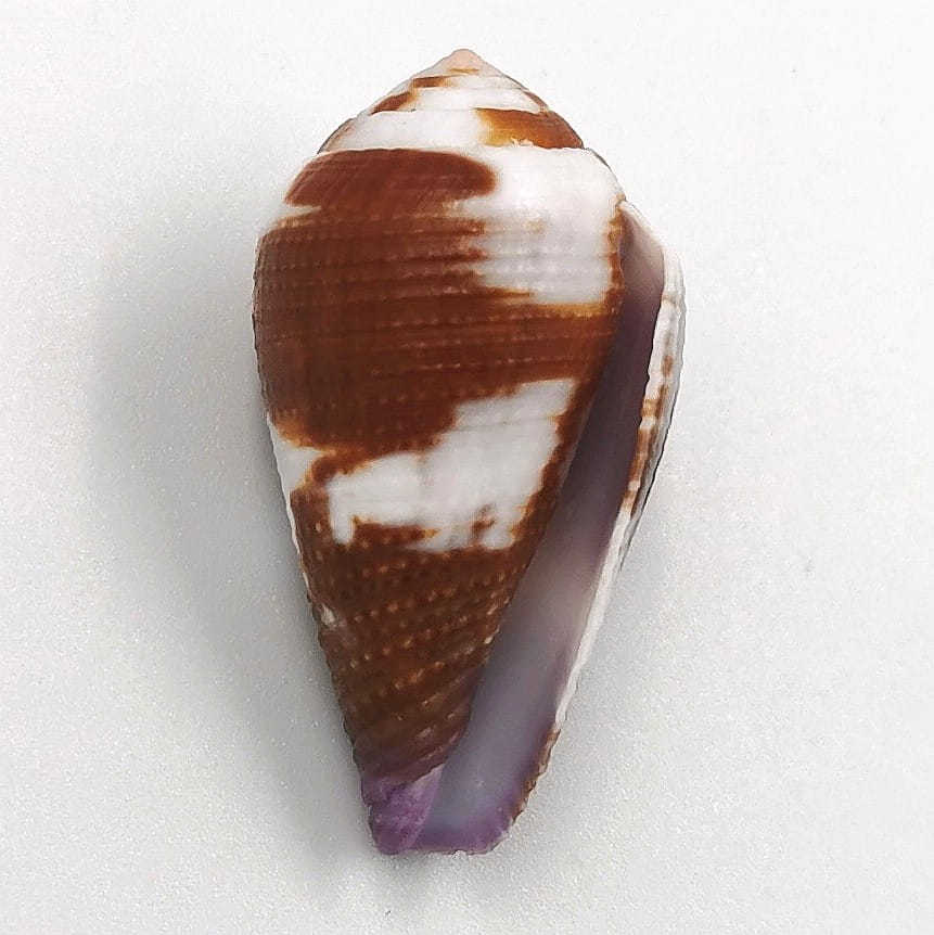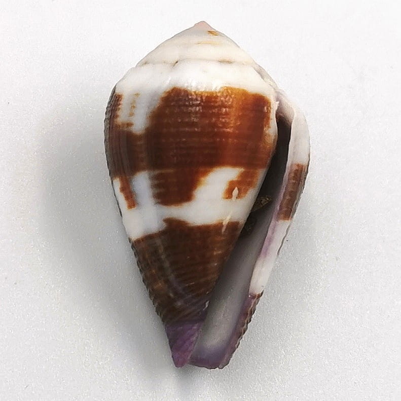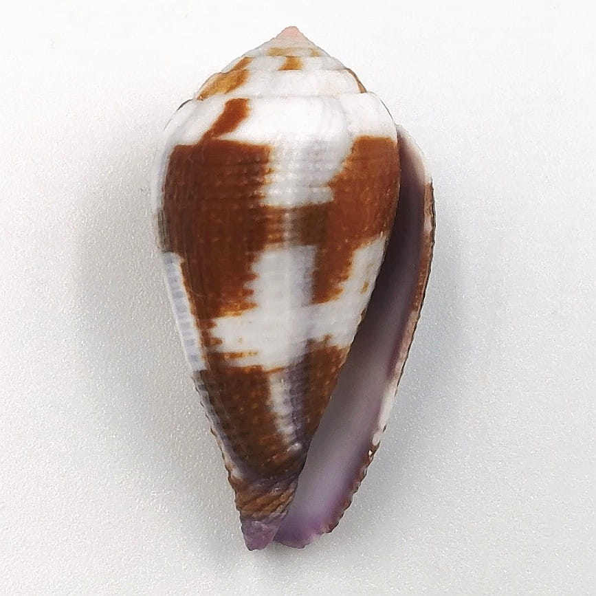 Oferujemy muszle tego dość rzadkiego stożka pochodzące z wyspy Mactan na Filipinach w typowych odcieniach brązu z bielą i lekkiego fioletu przy syfonie (na zdjęciach przedstawiono typowe egzemplarze), 32-33 mm, F++.